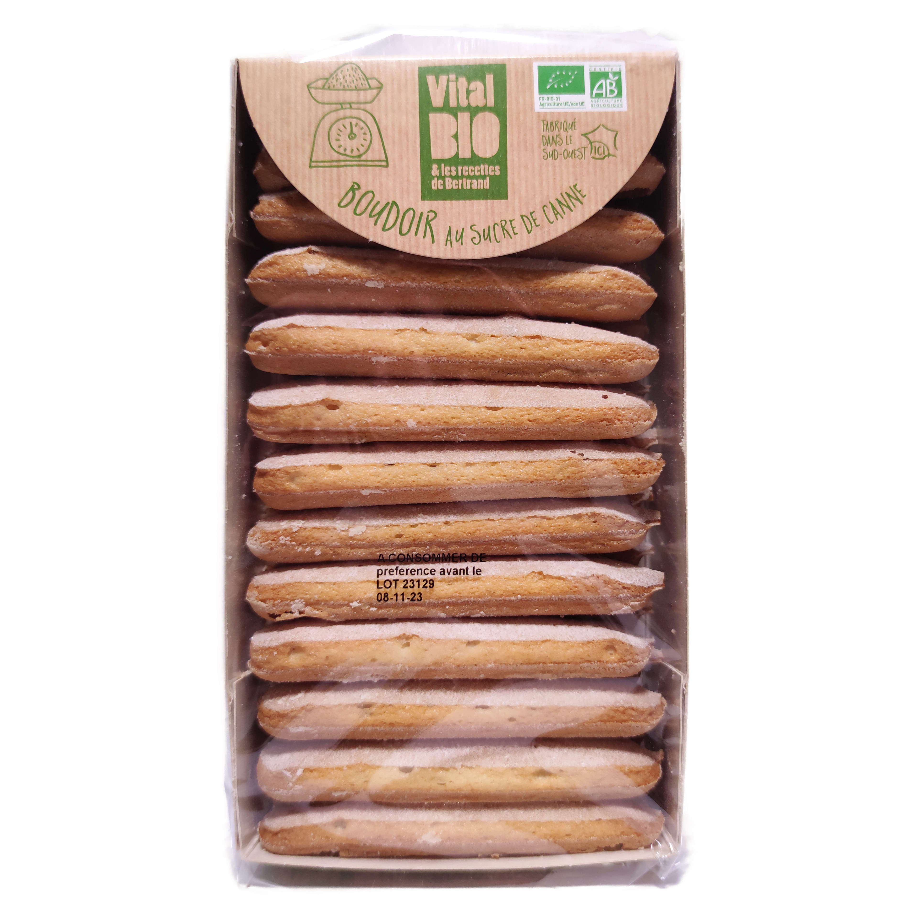Sucre de canne*, farine de blé* T65 d'Occitanie, oeufs frais* d'Occitanie (21%), sirop de sure inverti*, amidon de blé*, etrait de malt d'orge*, poudre à lever (bicarbonate d'ammonium), arôme naturel de vanille*, sel, épaississant (gomme xanthane)