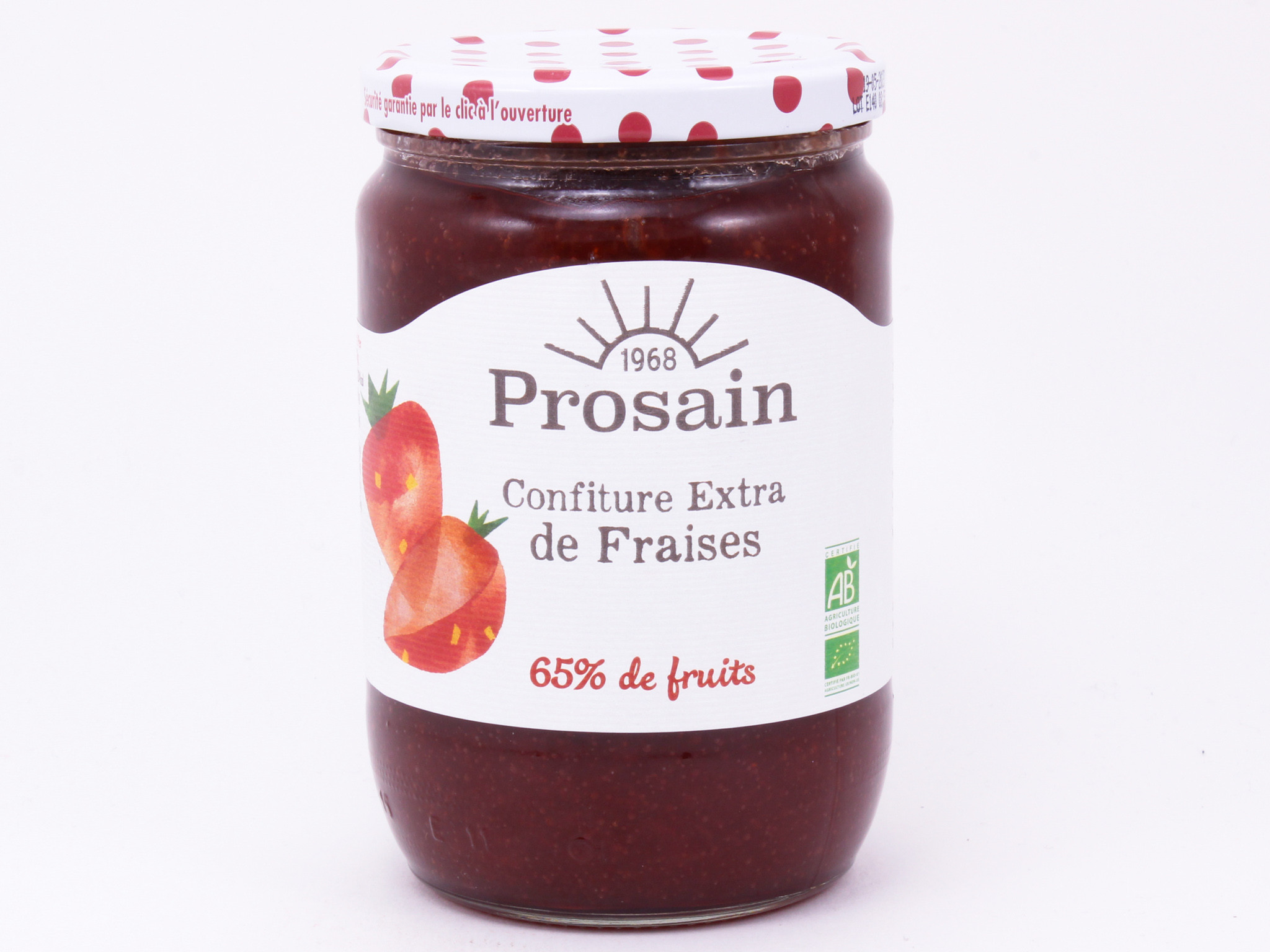 - Confiture Prosain bio extra de fraises, idéal pour le petit déjeuner ou le goûter.