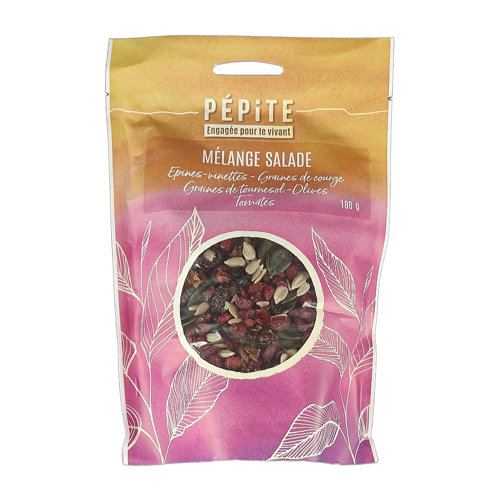 Epines-vinettes*, graines de courge*, graines de tournesol*, olives* séchées (olives*, sel), tomates* séchées (tomates*, sel).