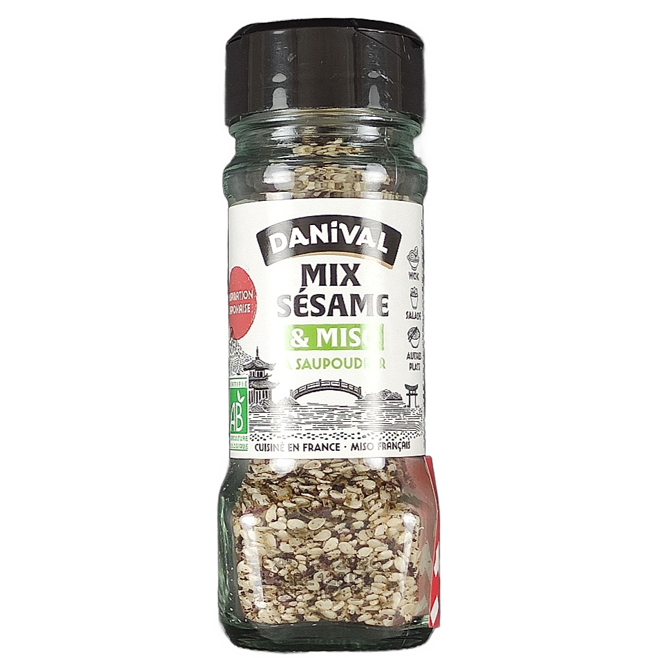 Graines de sésame* (sésame) 79%, miso* 10% (soja français* (soja), riz rond semi-complet*, sel marin non raffiné de l’Atlantique, enzyme (Aspergillus Oryzae)), sel, ciboulette*, dulse* (algue rouge), huile de tournesol*.