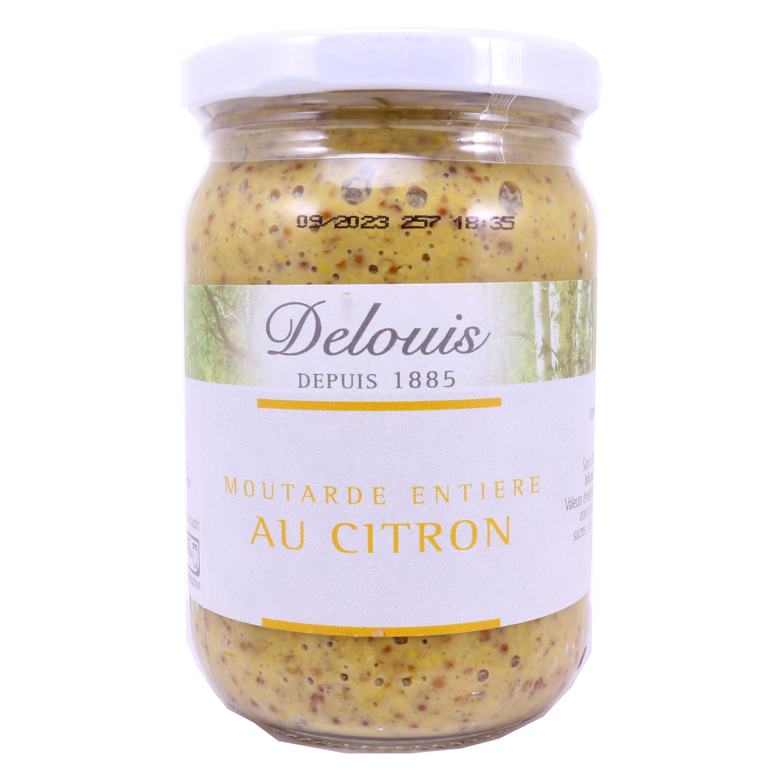 Vinaigre de cidre*, graines et téguments de moutarde*, eau, citrons* (10%), sel.