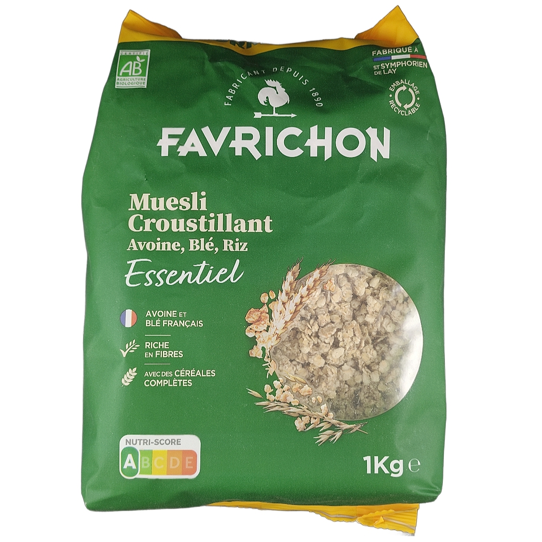 Céréales* complètes (flocons d’avoine*43,5%, flocons de blé* 21,7% riz* 7,2%), sucre de canne* non raffiné, huile de tournesol*, farine de blé* 5,8%.